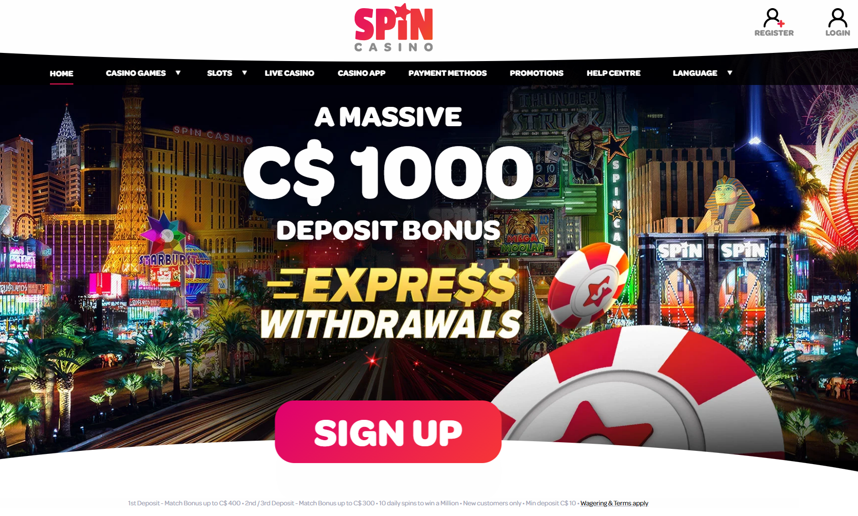 Sign up bonus$1000 Deposit Bonus100 FREE Spins on Wheel of Wishes 600+ state of the art mobile slots No minimum limits for any withdrawal Exciting VIP Program Thousands of customer reviews 24/7 legendary customer supportSpin CasinoPlay Now