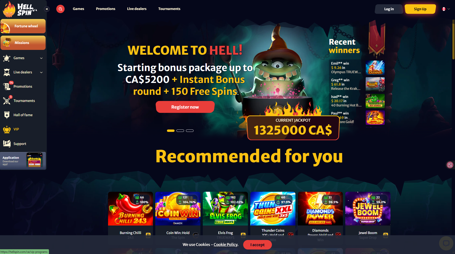 Sign up bonusC$5200 + 150 FS Welcome BonusGenerous Welcome Bonus Over 4,000 Slots Games High payout rate of 96.25% Over 500 live dealer tablesHell Spin CasinoPlay Now