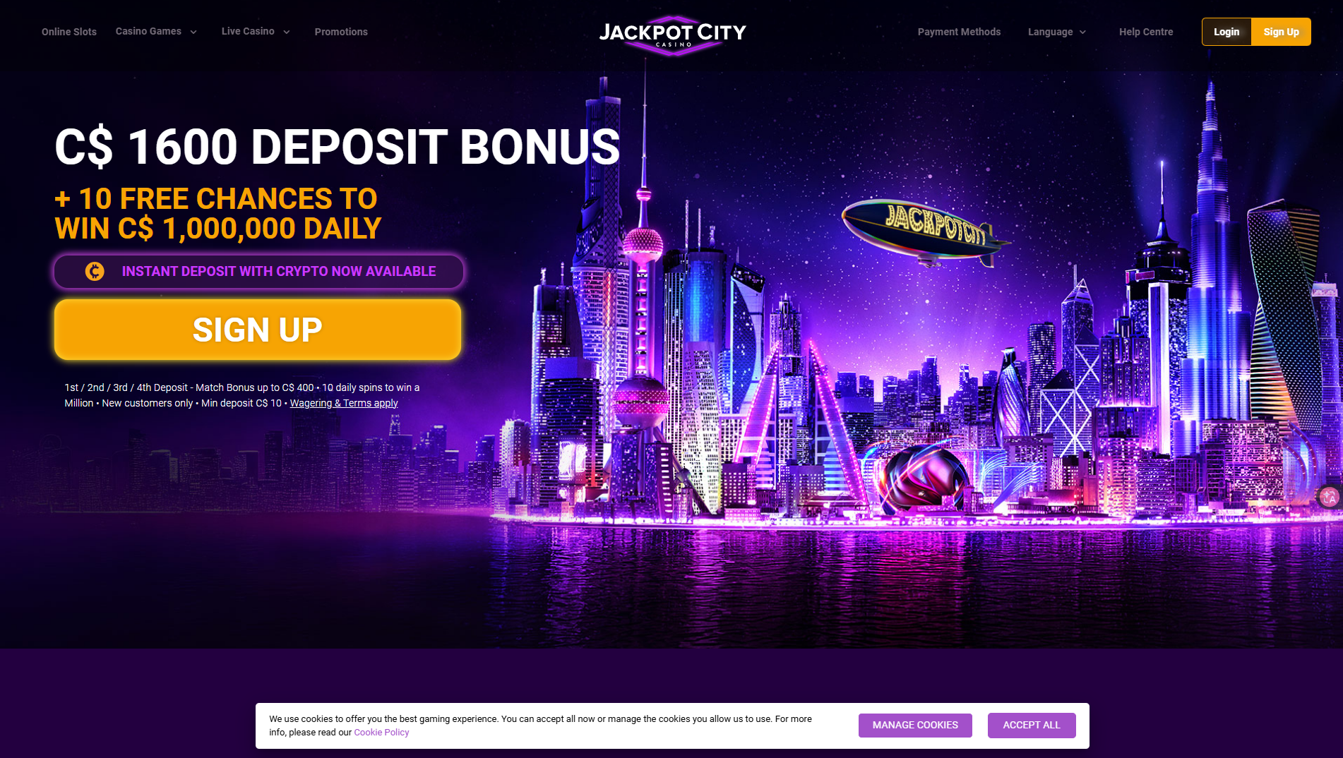 Sign up bonusUp to $1600 Welcome BonusRapid Cashouts: Done in 48-72 hours Low Risk: Play as little as 1c per spin Reliable Odds: Independently audited SSL Security: On all credit paymentsJackpot CityPlay Now